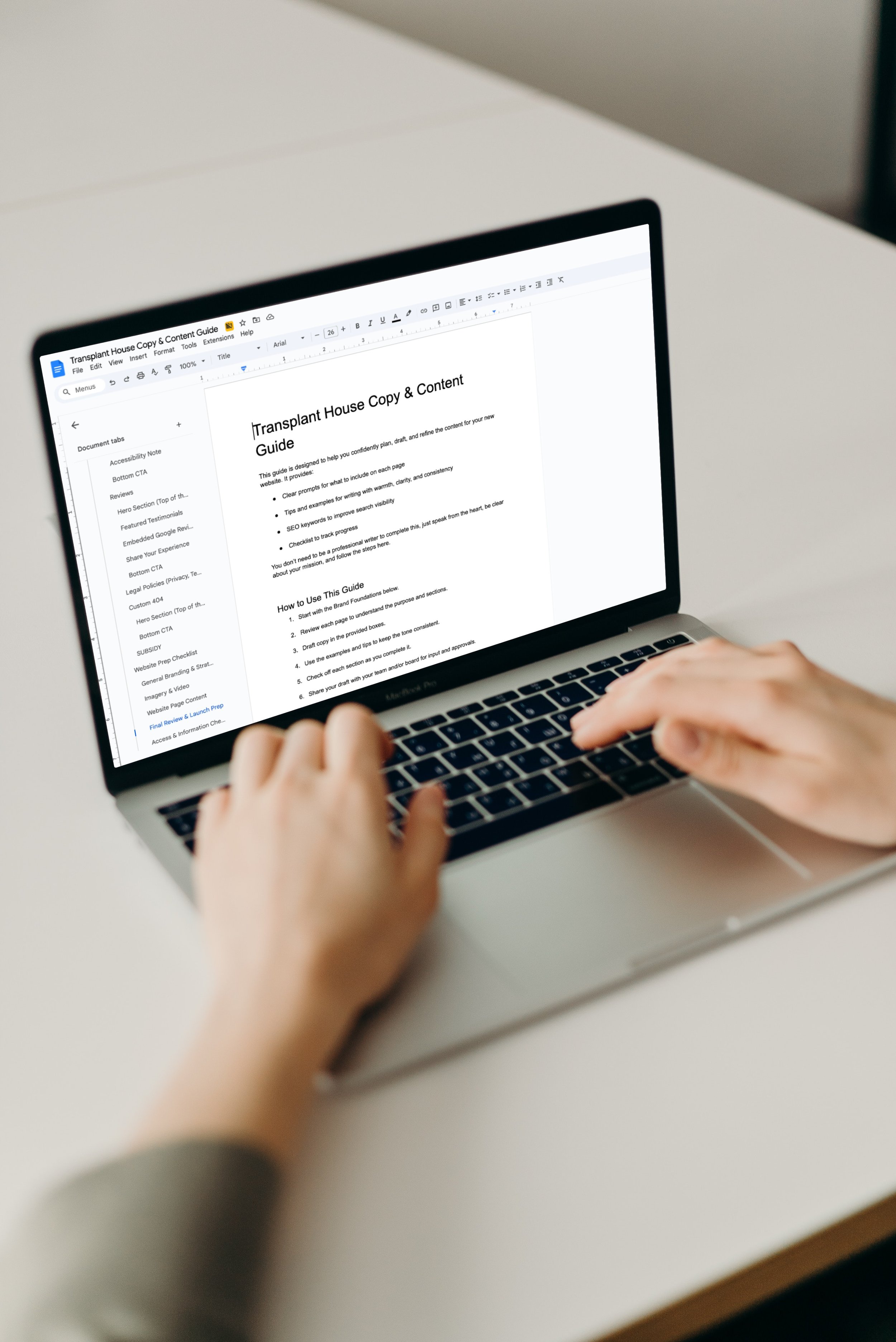 We began by listening. The Transplant House team had decades of heart and impact behind them but an outdated website, scattered tools, and brand inconsistencies made it hard to tell their story clearly. Through early onboarding calls, audits, and mood boards, we uncovered what they really needed: a unified system that reflected their compassion online and off and made daily tasks easier behind the scenes.